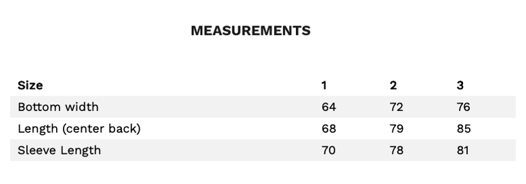 Size 1 is a smaller option, generally suited for sizes XS–M. The fit will vary depending on individual body measurements, ranging from an oversized look to a more cropped silhouette.