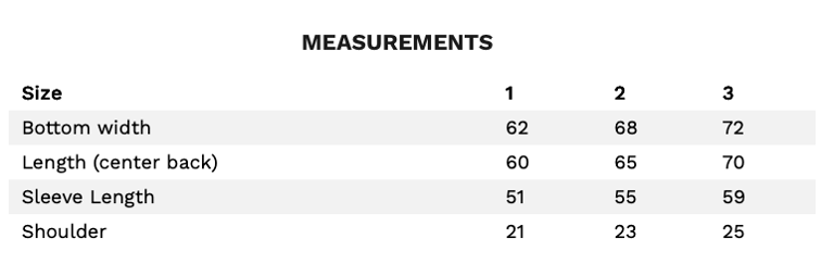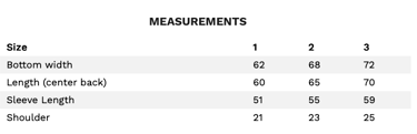 Size 1 is the smallest option, generally suited for sizes XS–M. The fit will vary based on body measurements, ranging from an oversized look with extra-long sleeves to a more cropped silhouette with wide, long sleeves.